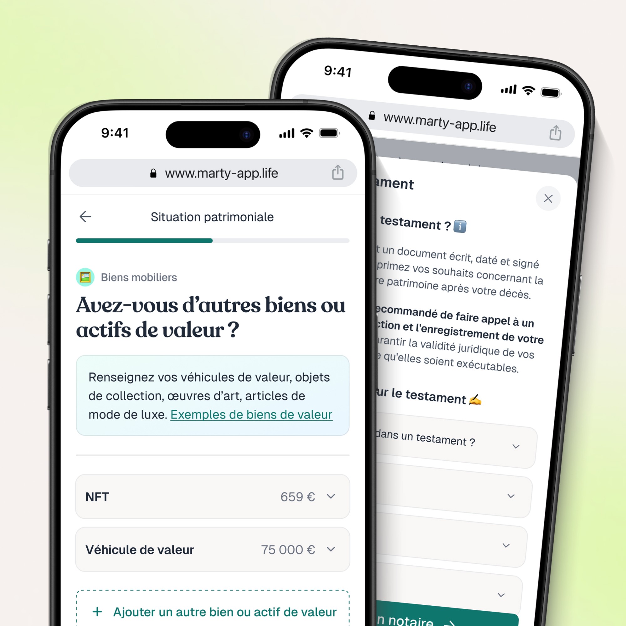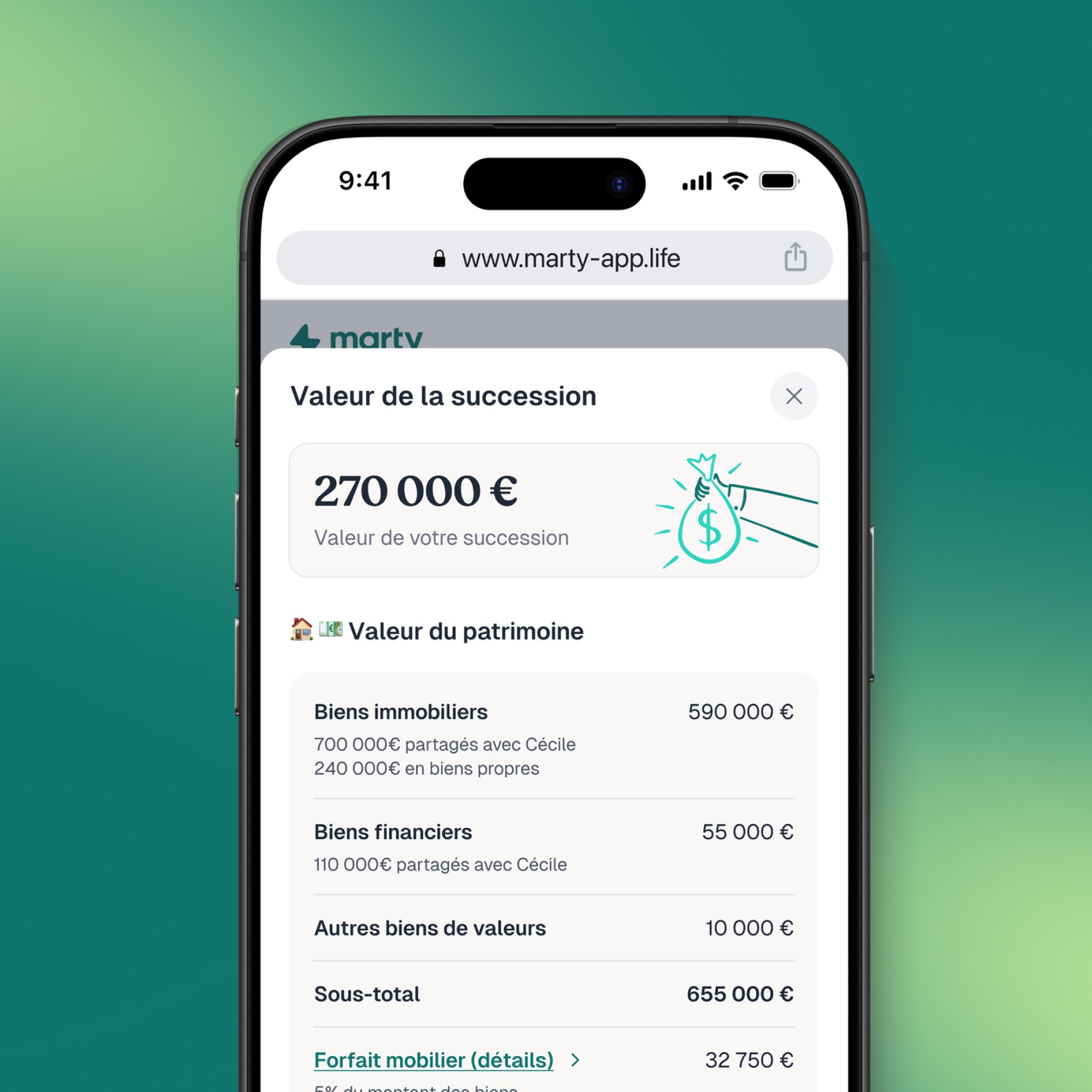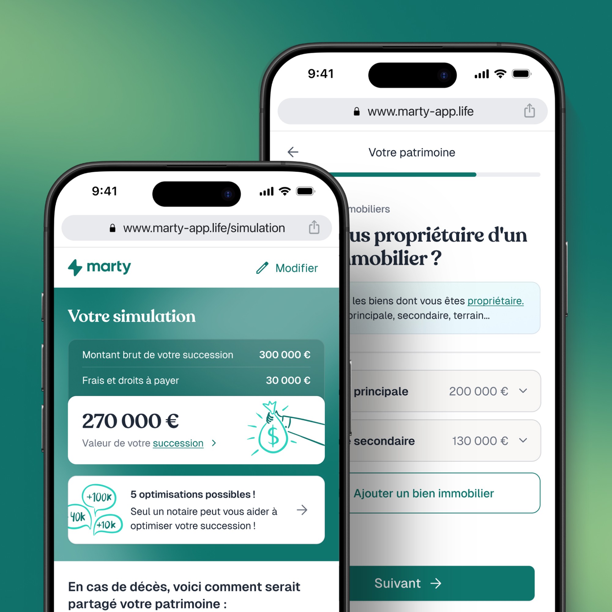 Marty vous donne immédiatement votre dévolution successorale et vous conseil pour optimiser la transmission de votre patrimoine. Des propositions adaptées à votre situation, expliquées simplement. Il ne vous reste plus qu’à choisir un Notaire si vous en avez pas pour commencer l’anticipation de votre succession !